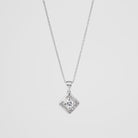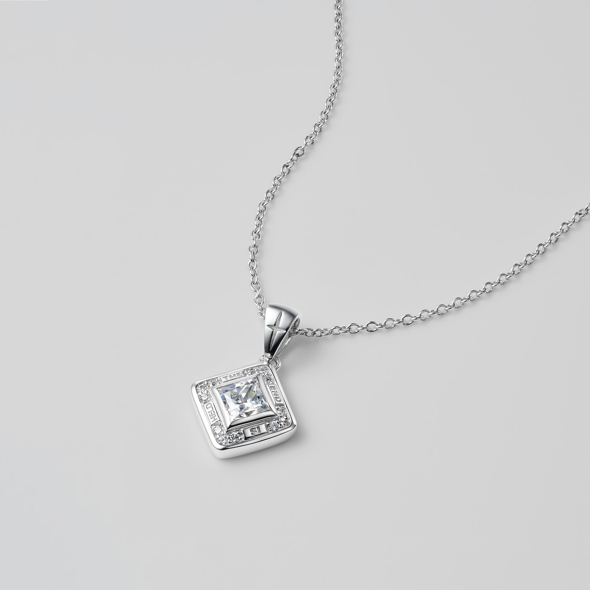 A refined square silhouette set with a single stone at the center, surrounded by stones that shine with a contrasting brilliance.