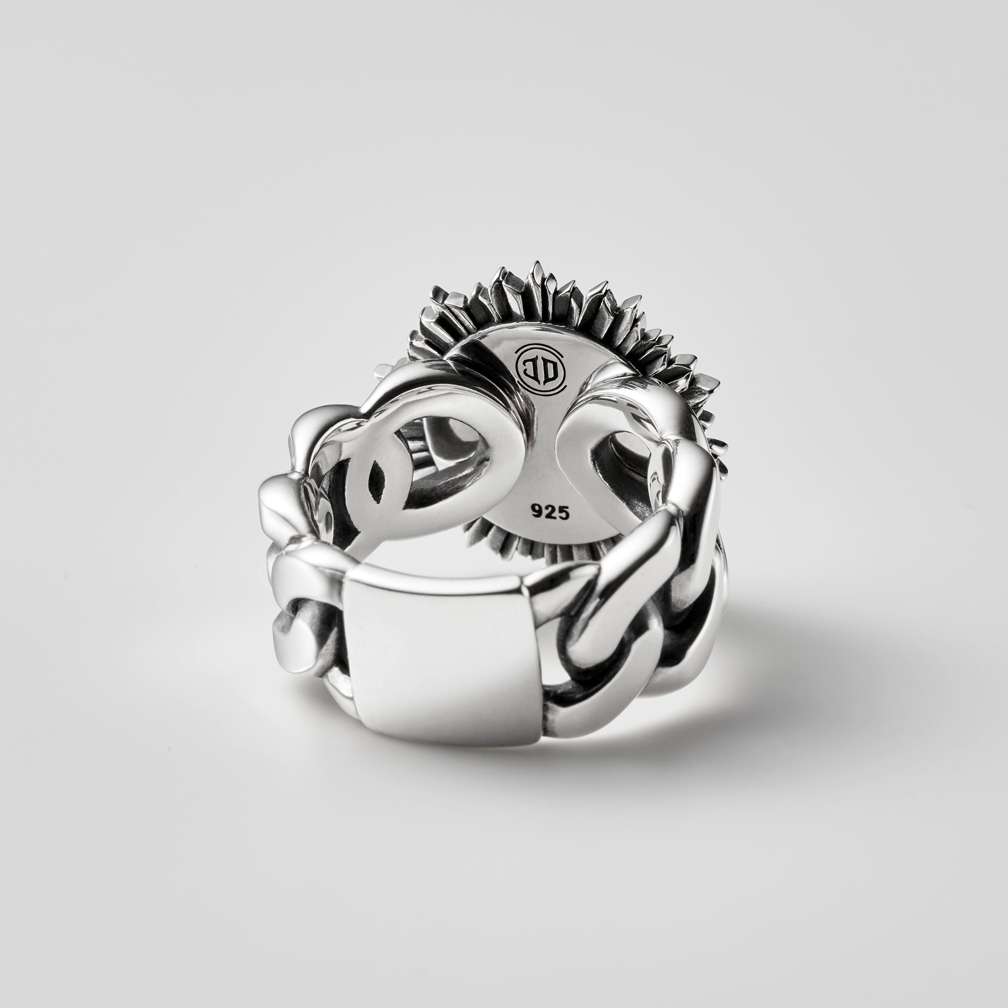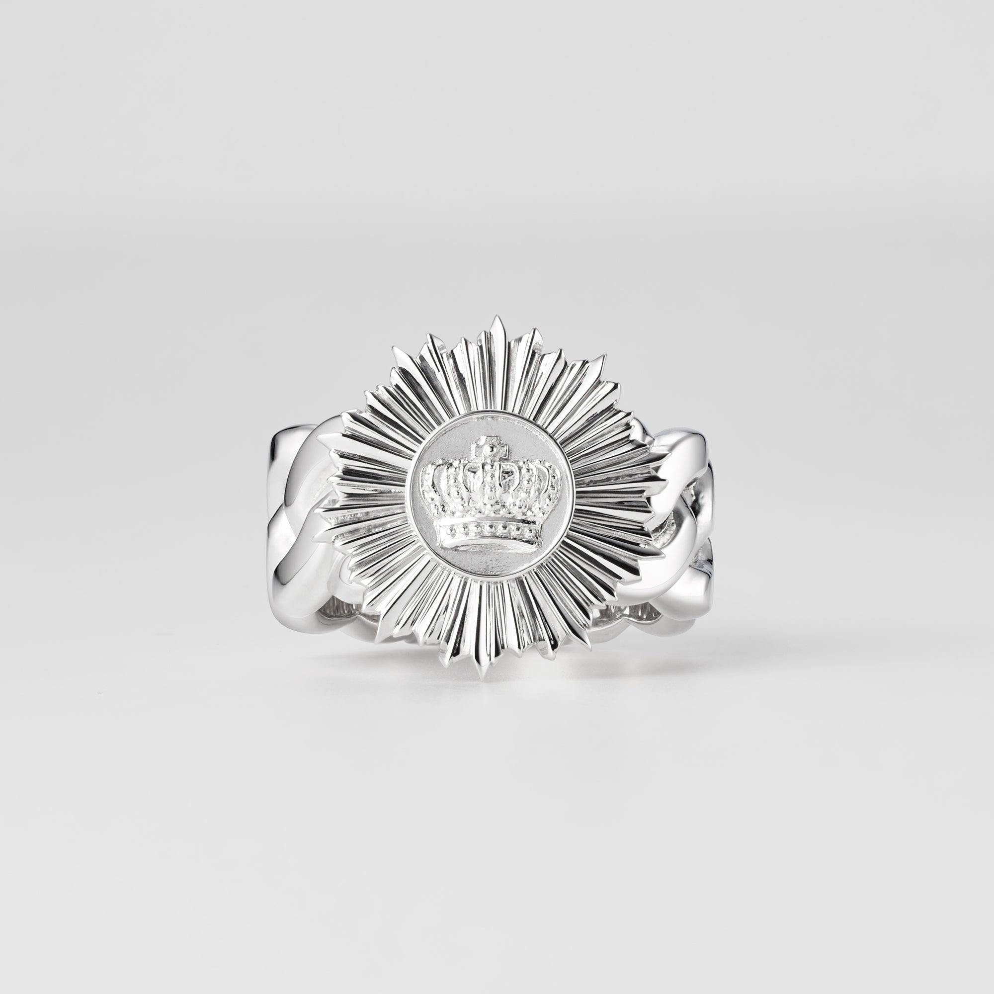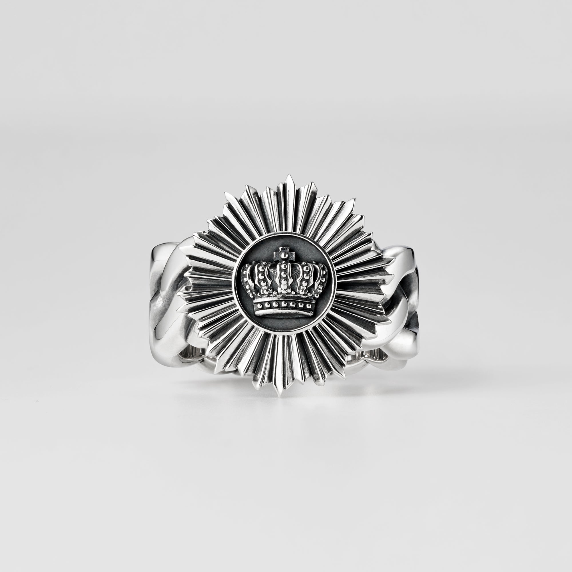 A ring with a crown motif finely expresses the shining halo. The arm consists of right voluminous chain. May the light of happiness continue to brighten people wearing this ring.