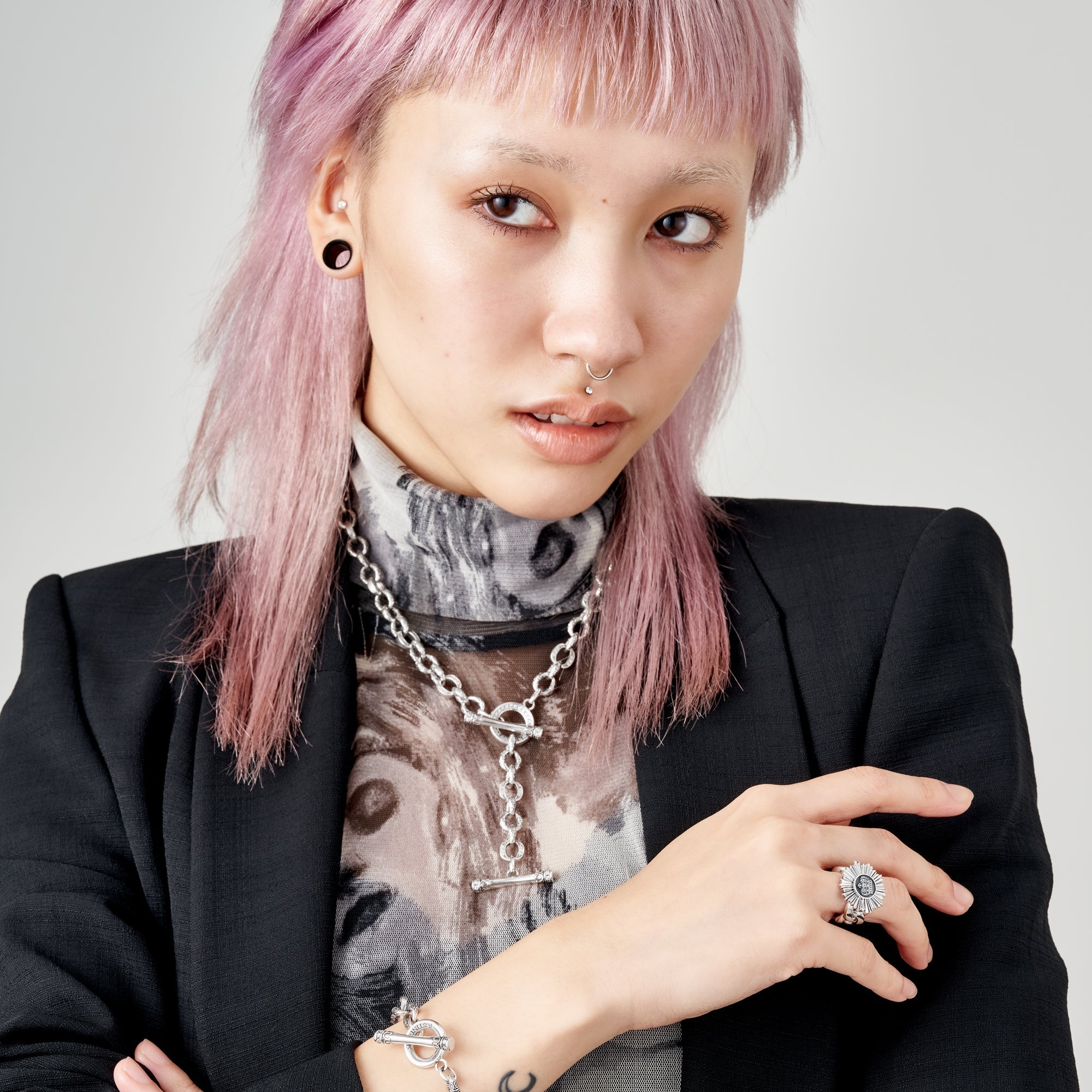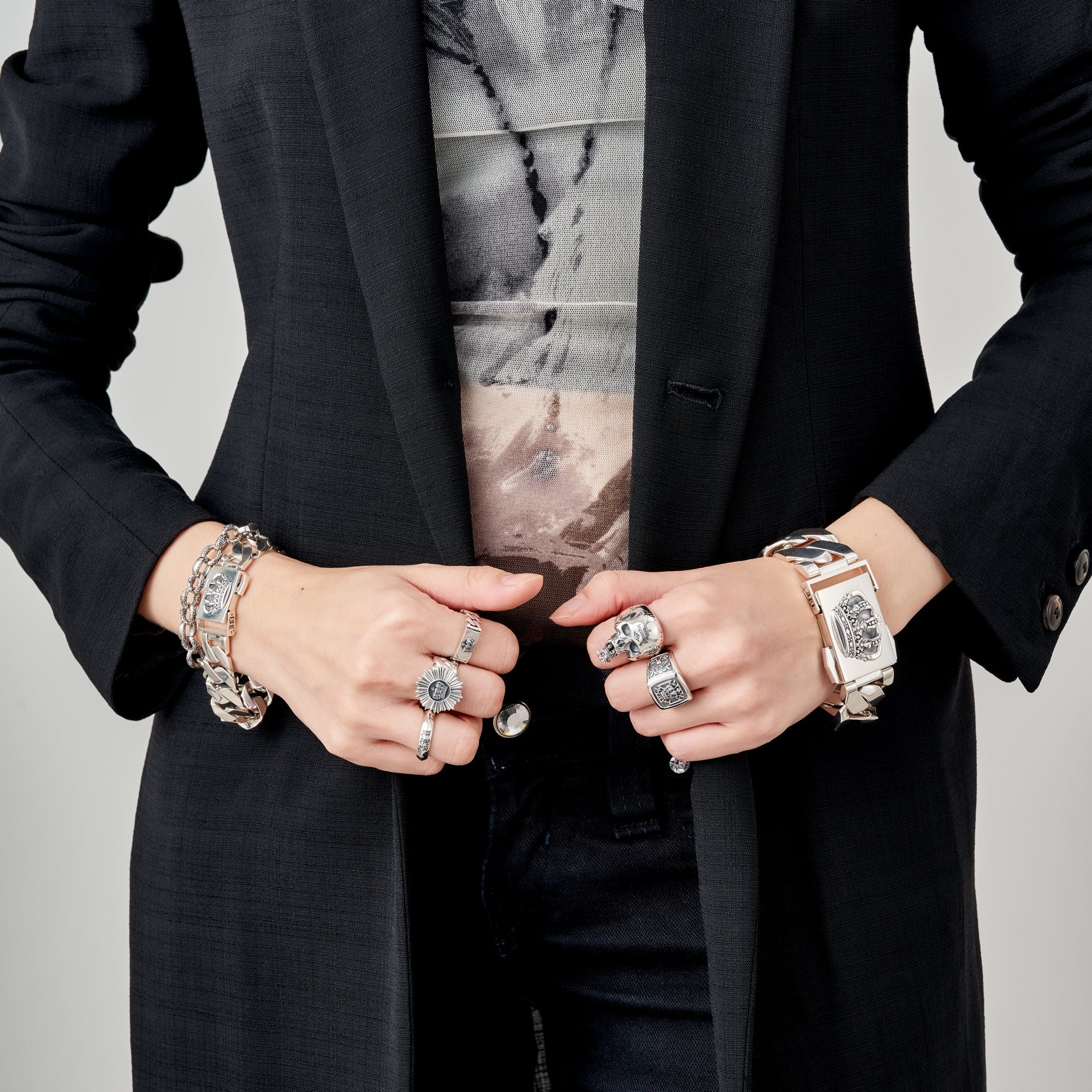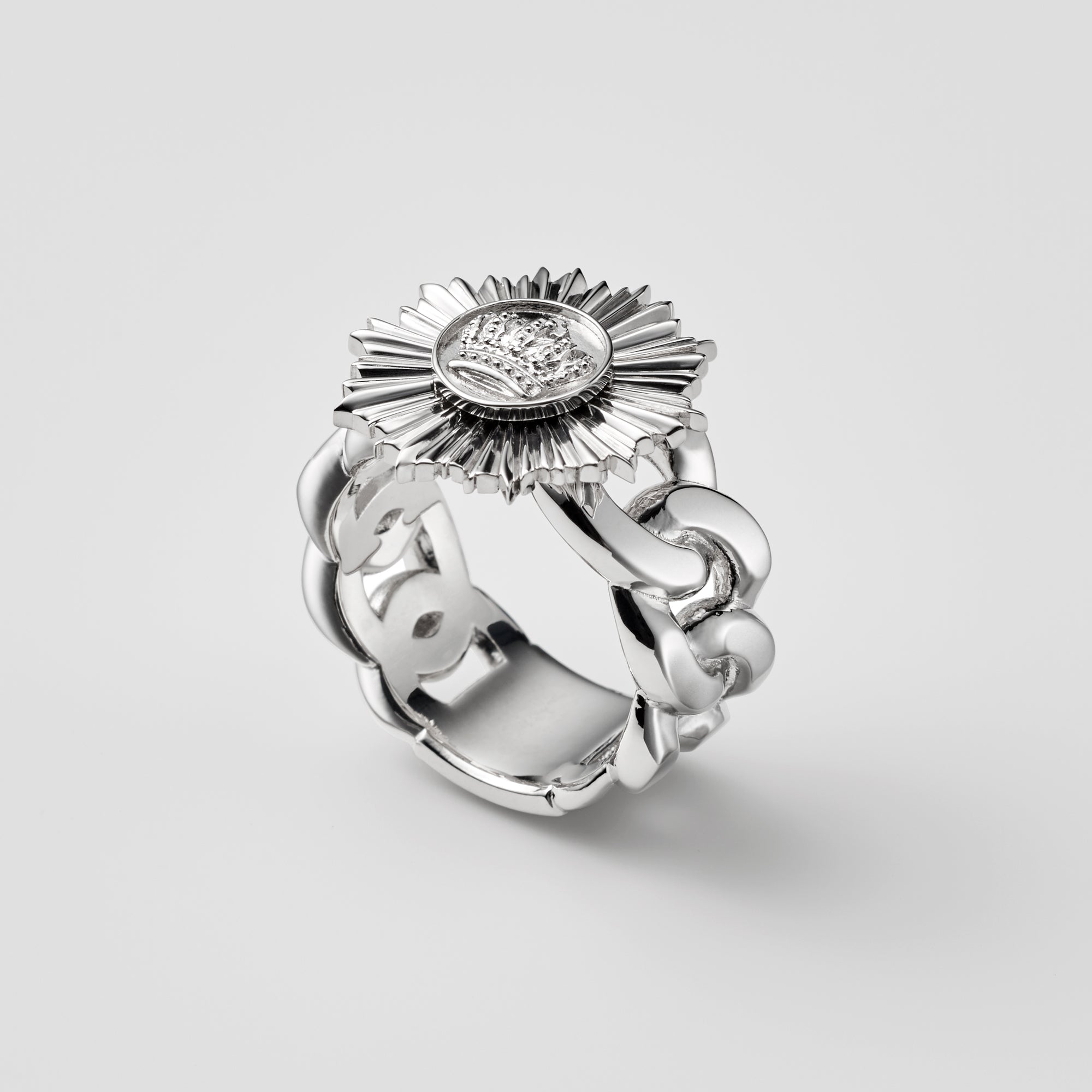 A ring with a crown motif finely expresses the shining halo. The arm consists of right voluminous chain. May the light of happiness continue to brighten people wearing this ring.