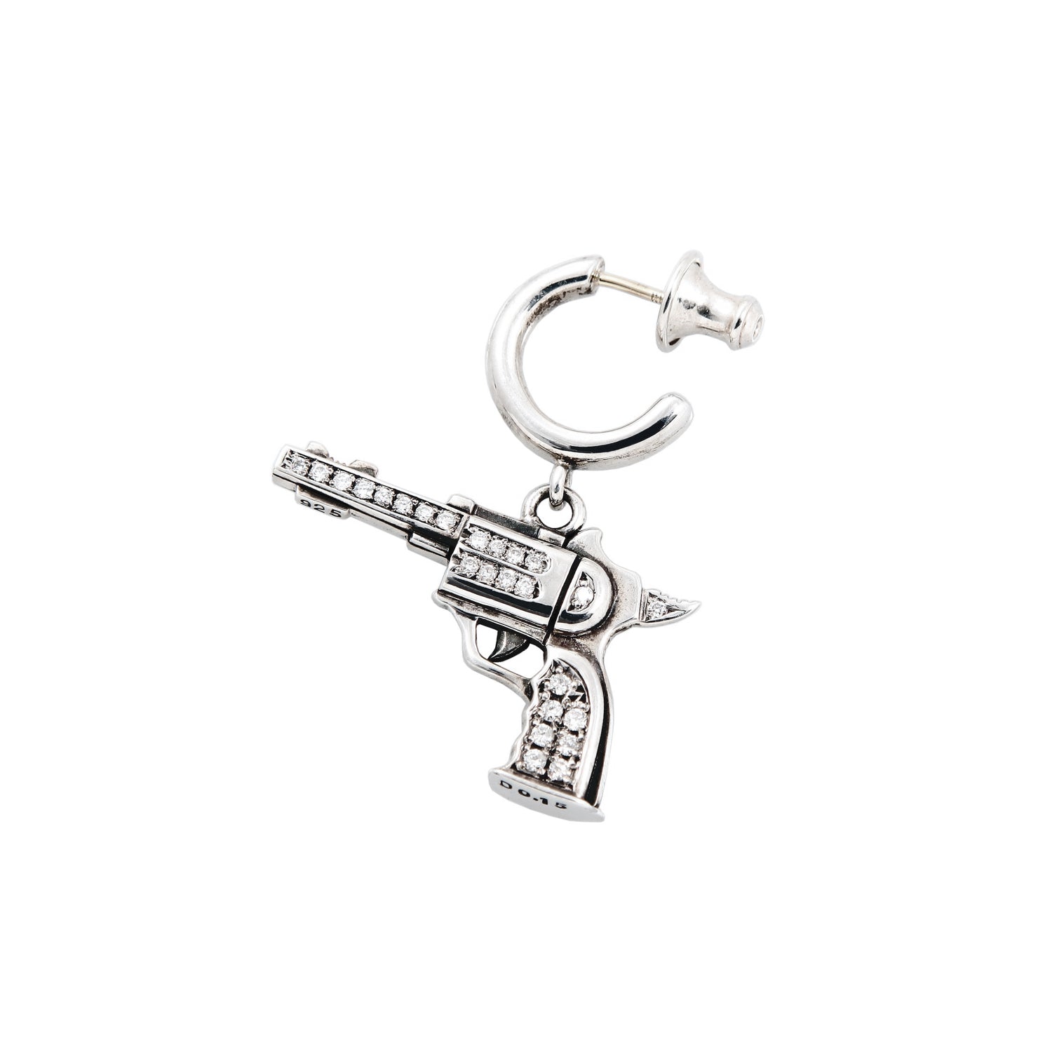 Pistol motif earrings set with pavé diamonds.