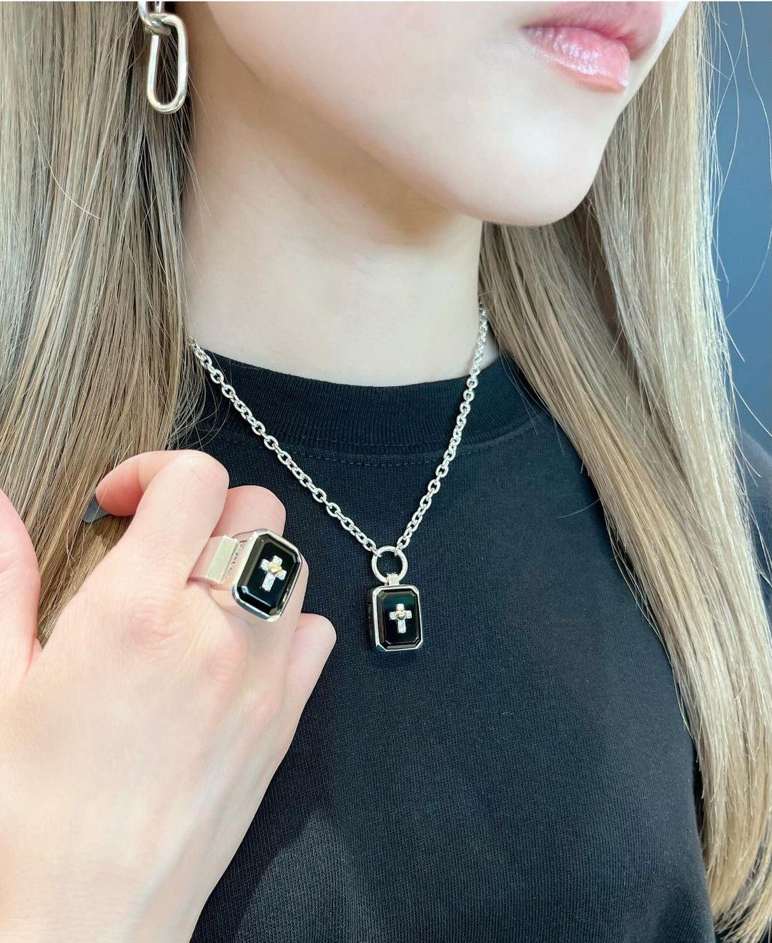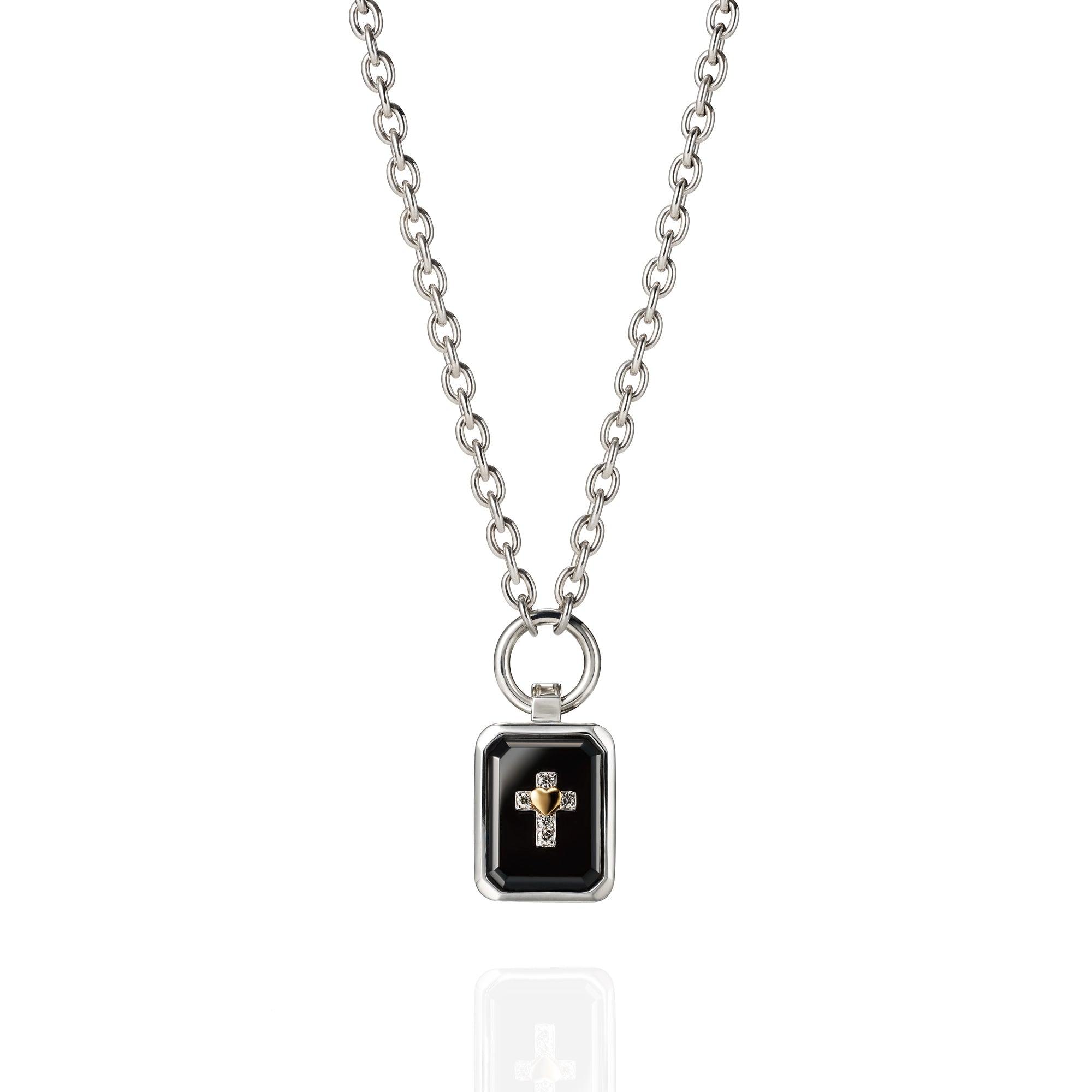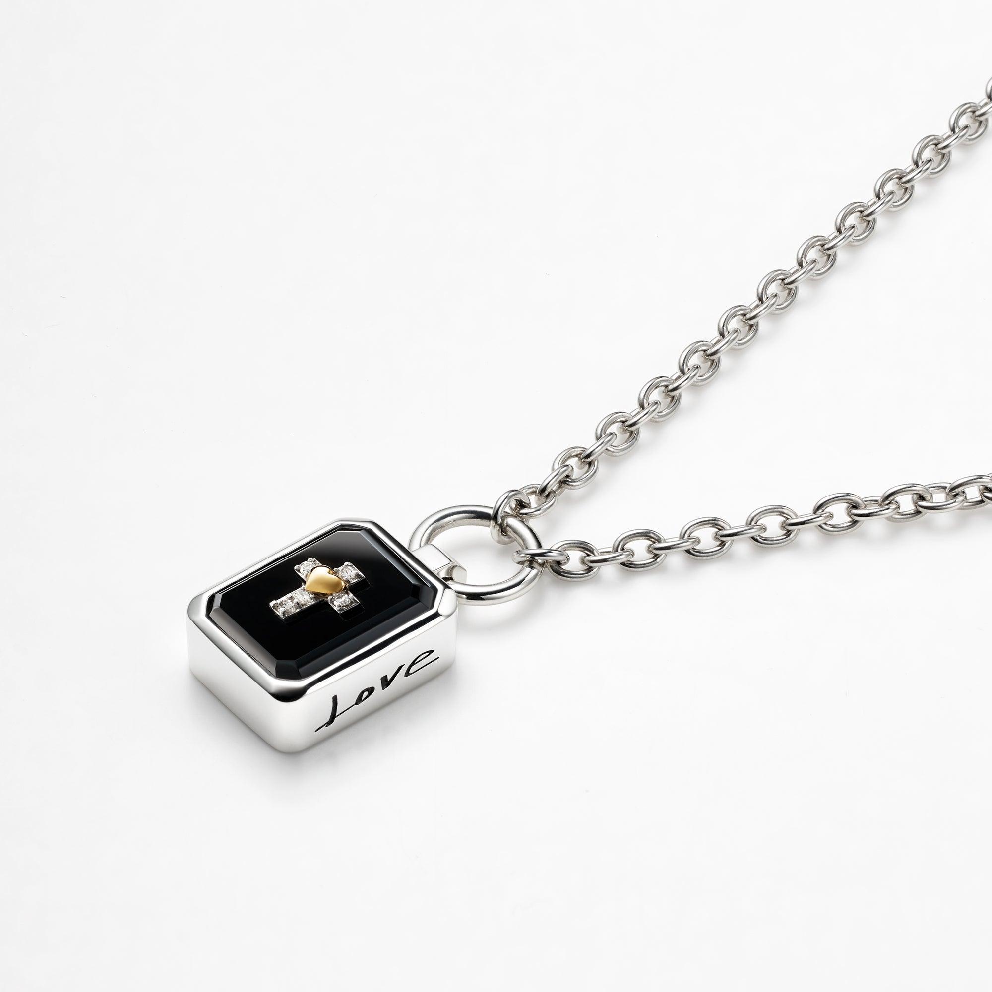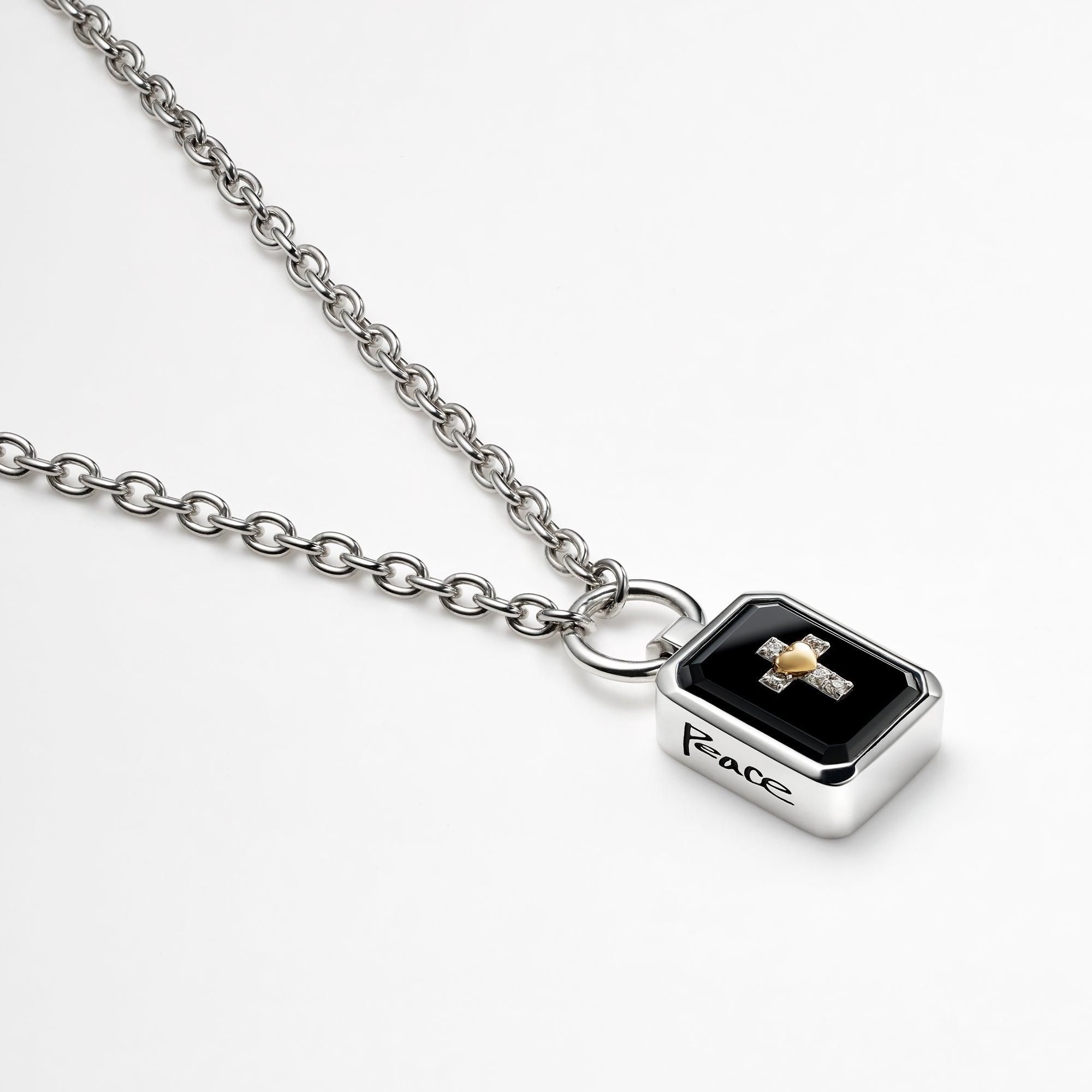 Cross and heart motifs set at the center of sparkling jet-Black and emelard-cut Onyx and the carved handwriting words on the sides are overflowing with strong feelings for "Love" and "Peace".