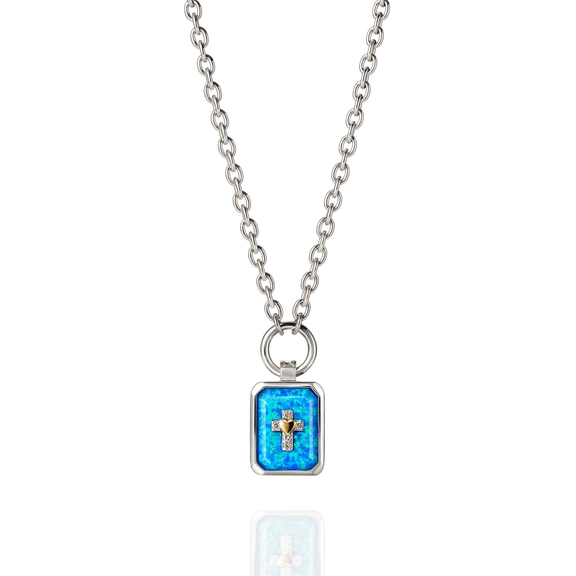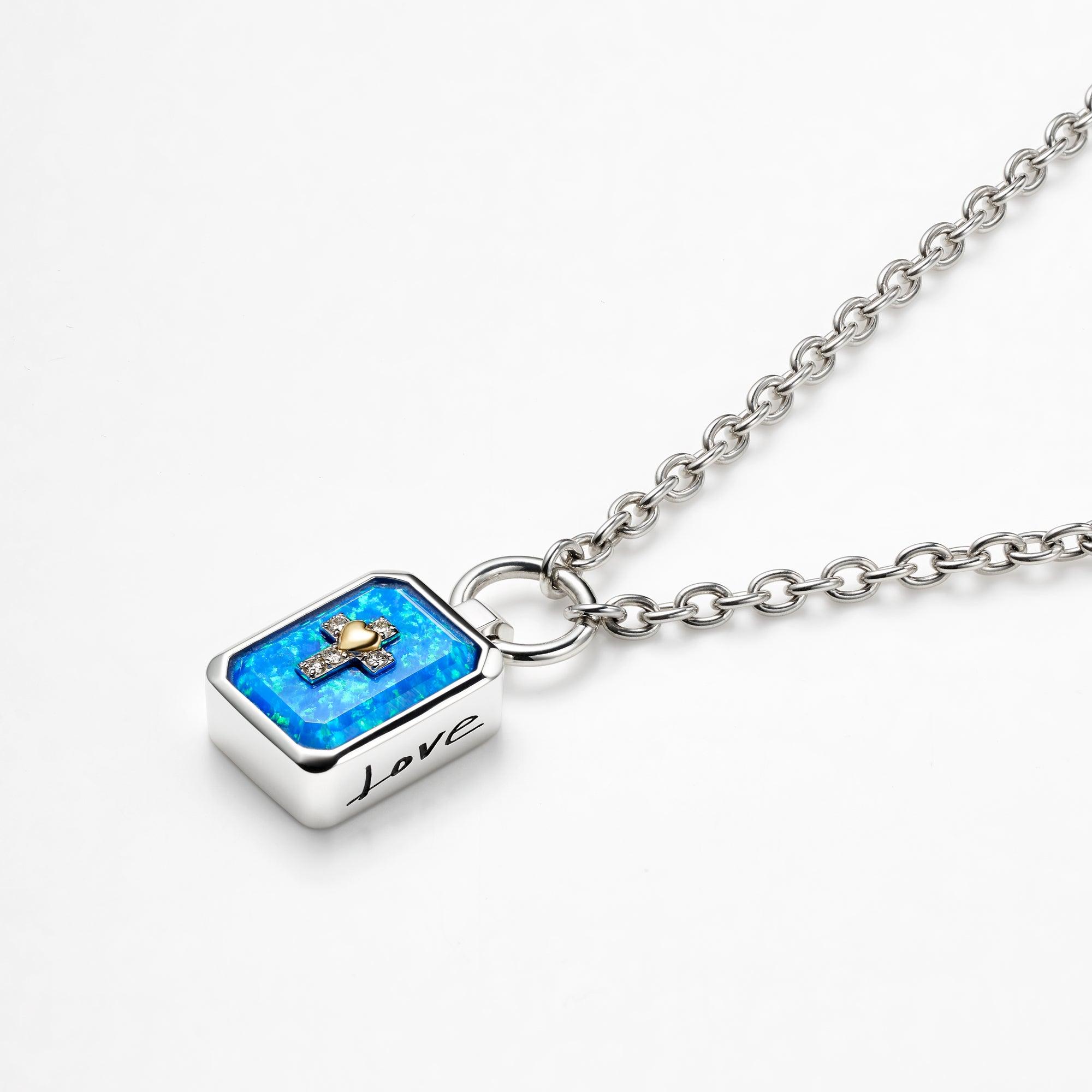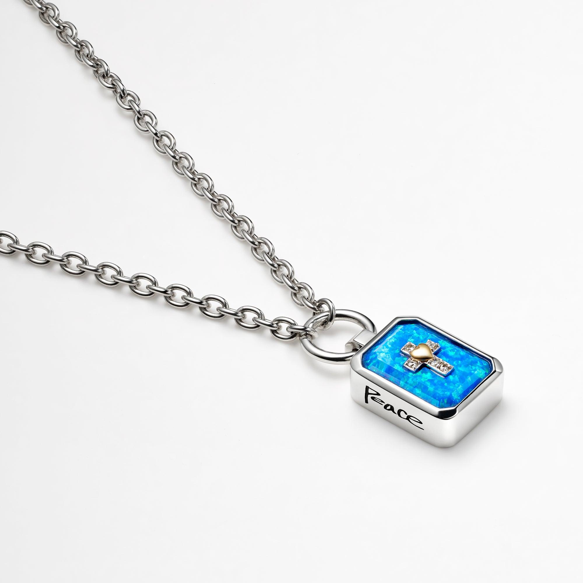 Cross and heart motifs set at the center of the synthetic opal reminding of rainbow over ocean and sky and the carved handwriting words on the sides are overflowing with strong feelings for "Love" and "Peace".