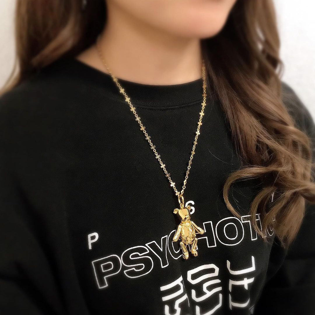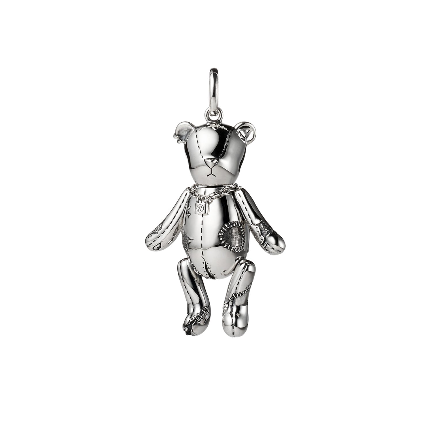 The bear named Sick Boy from this large pendant is all patching and the filling pops out, showing it has been loved so long. The cold bear yet with movable arms and legs makes expressive presence on your neck.