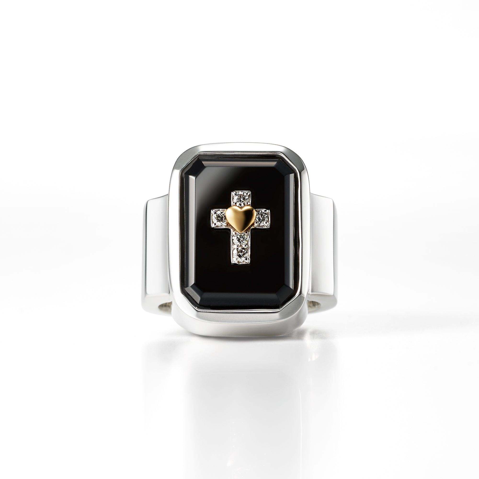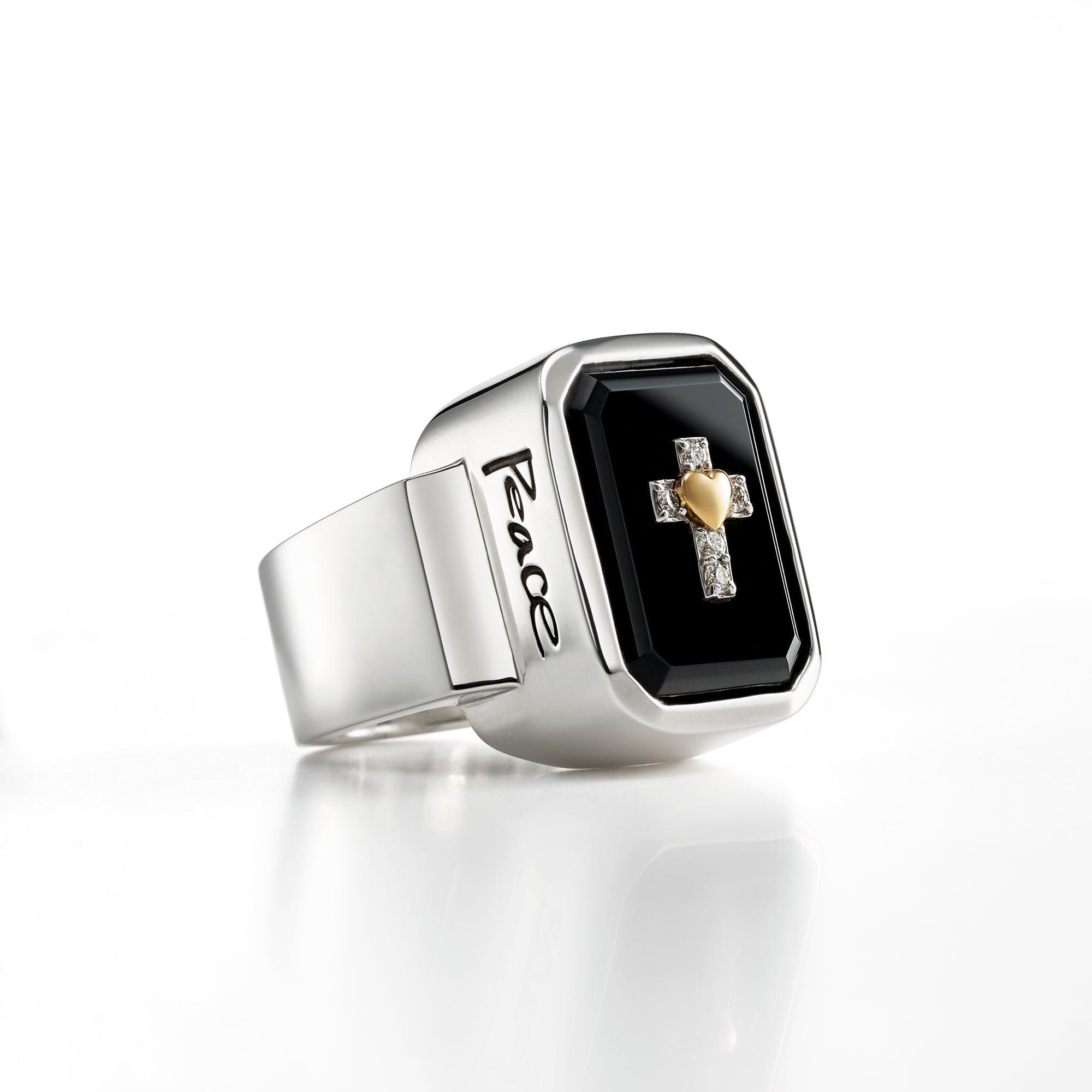Cross and heart motifs set at the center of sparkling jet-Black and emelard-cut Onyx and the carved handwriting words on the sides are overflowing with strong feelings for "Love" and "Peace".