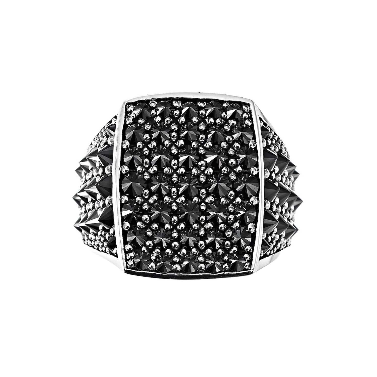 The leather jacket back style with the arms forms this fine ring. Decorated with gemstones like studs. The riders jacket front side is carved on the inner side.
