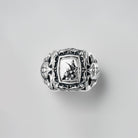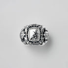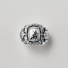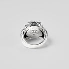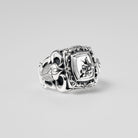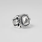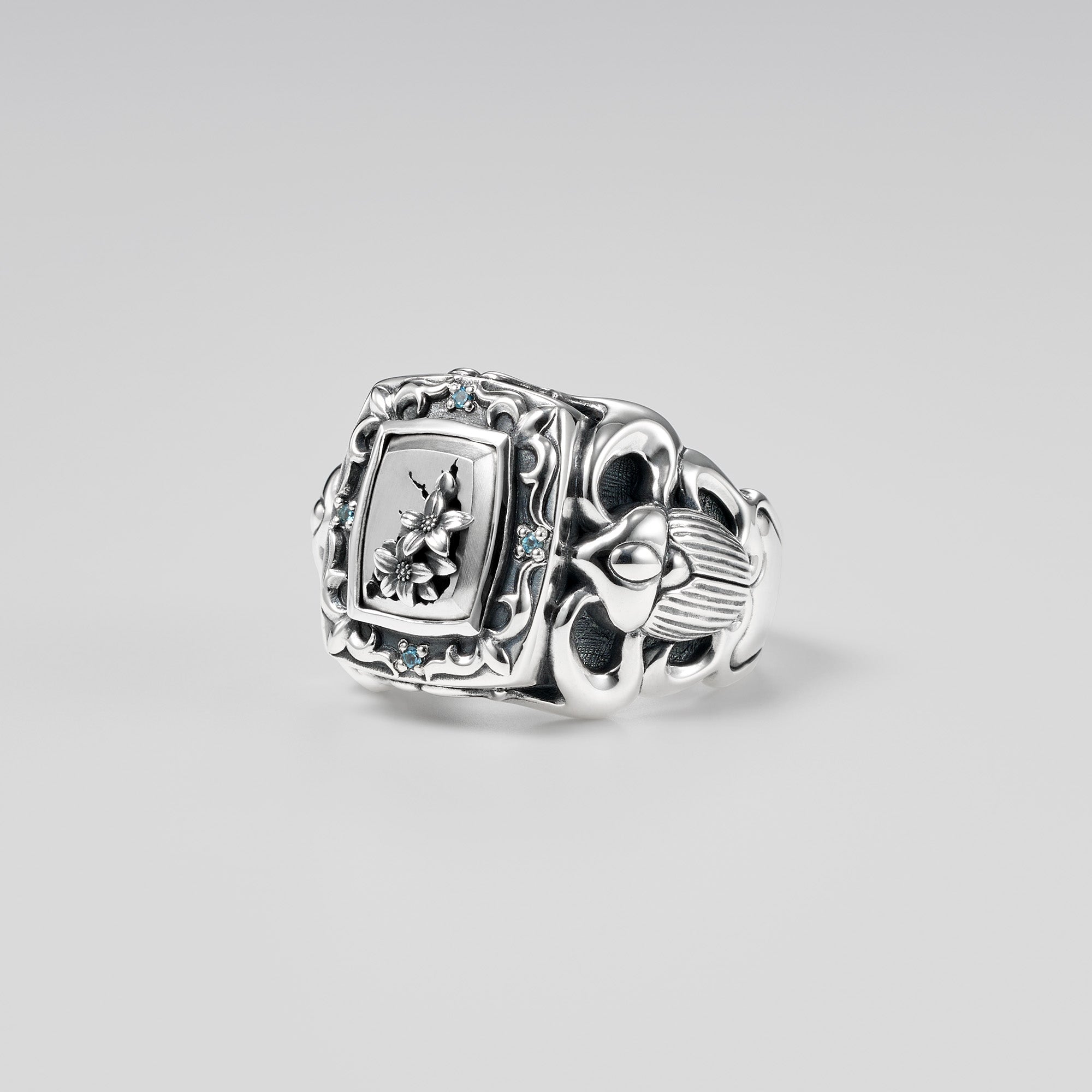 A ring adorned with side engravings of crowns and scarabs, and a flower blooming powerfully from a fractured stone wall — a tribute to beauty born from endurance and time.