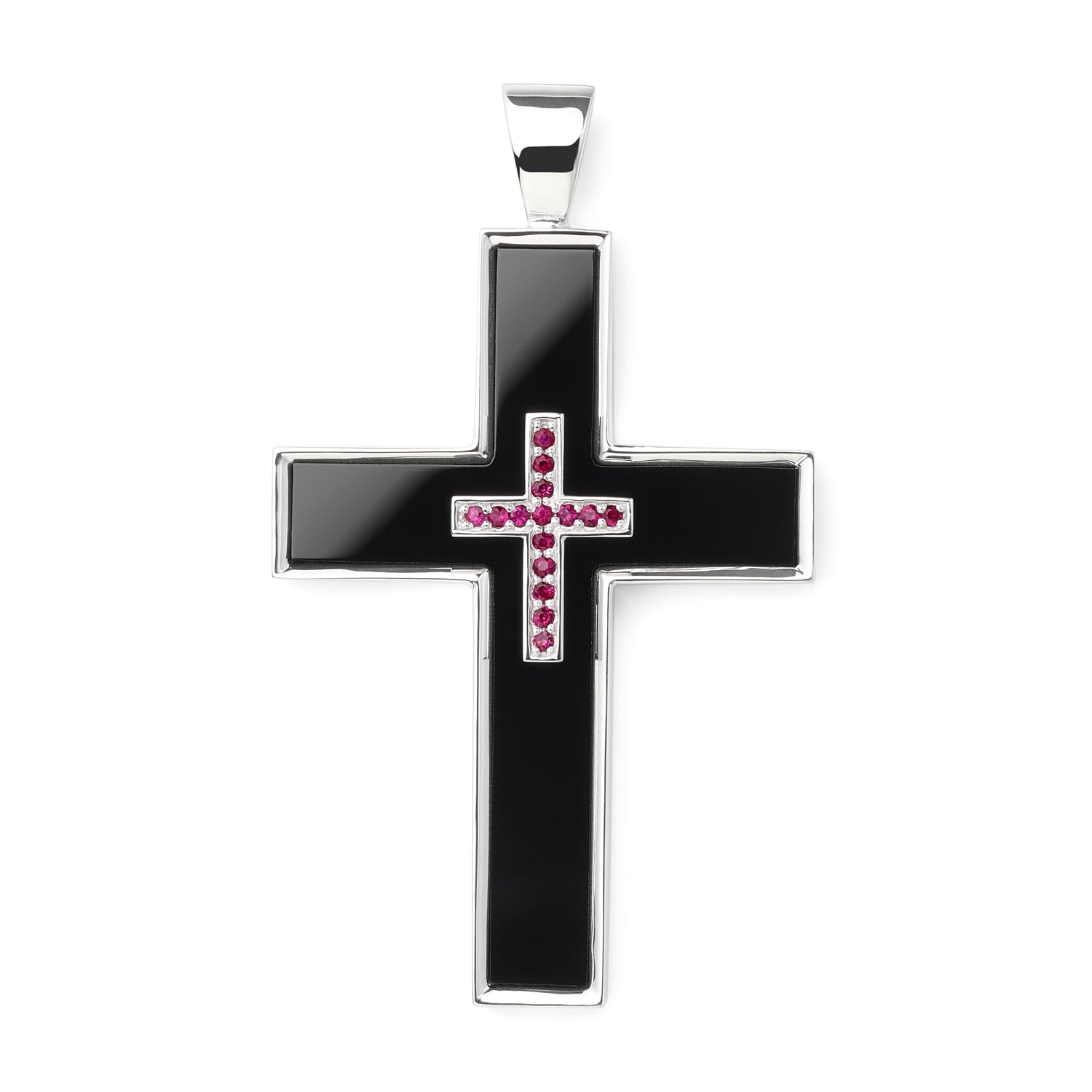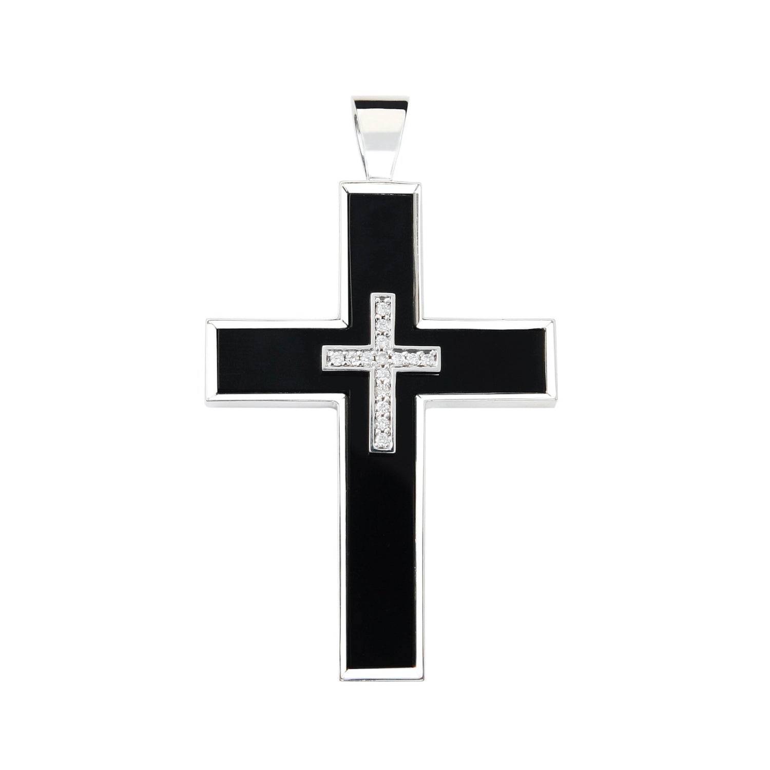 A long-time bestseller necklace has an onyx and diamonds set onto a large cross.