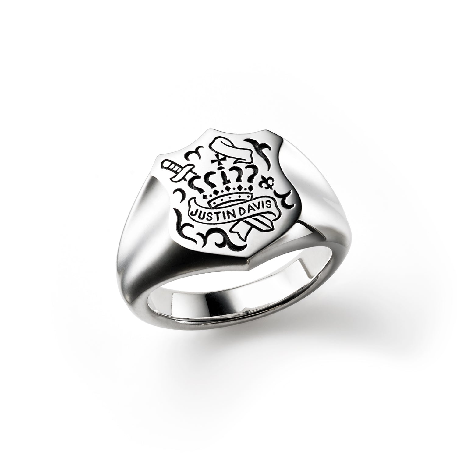 This shield-shaped signet ring with the right volume expresses our brand concept with carvings. Can be worn as a cool pinky ring.