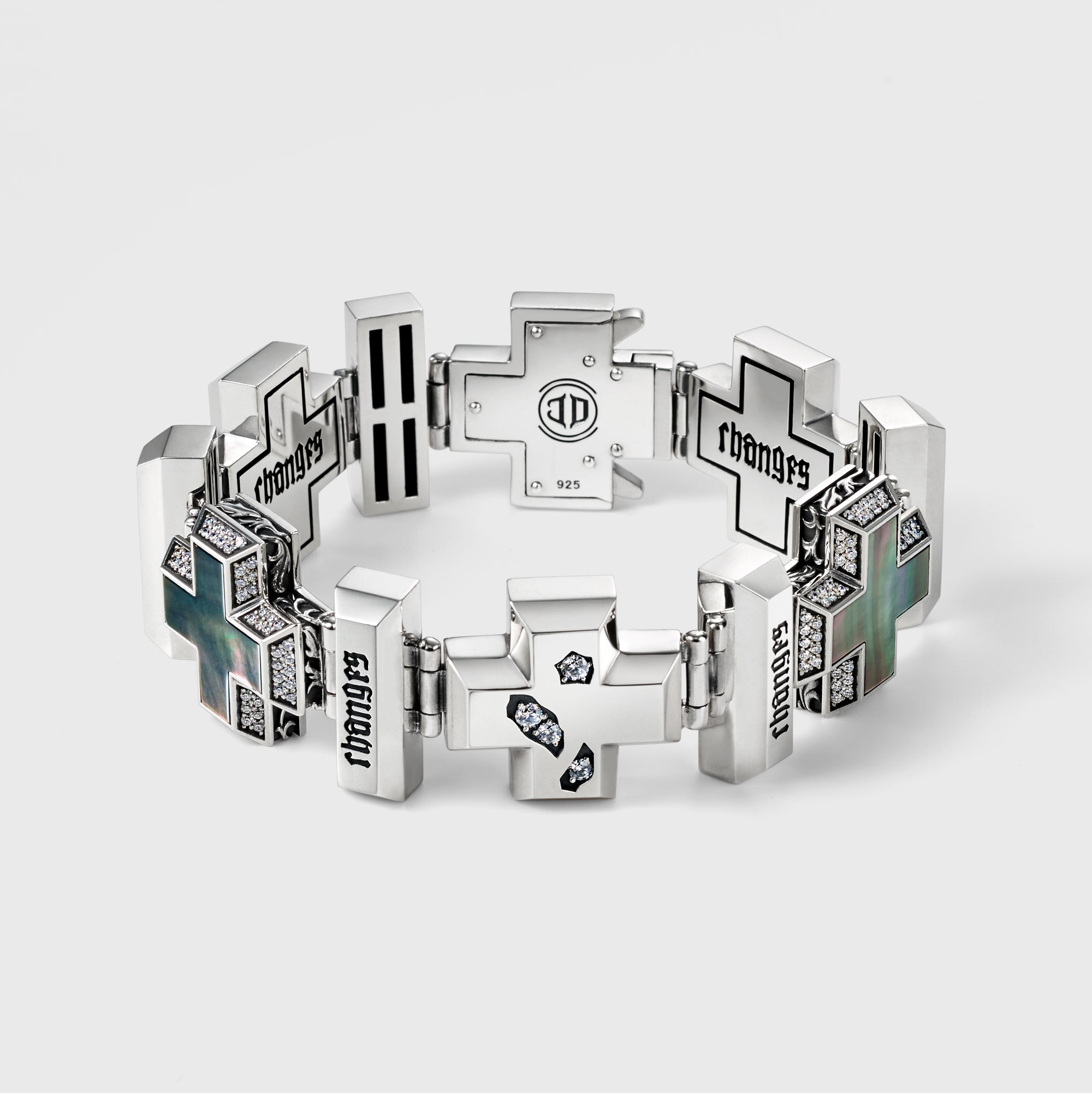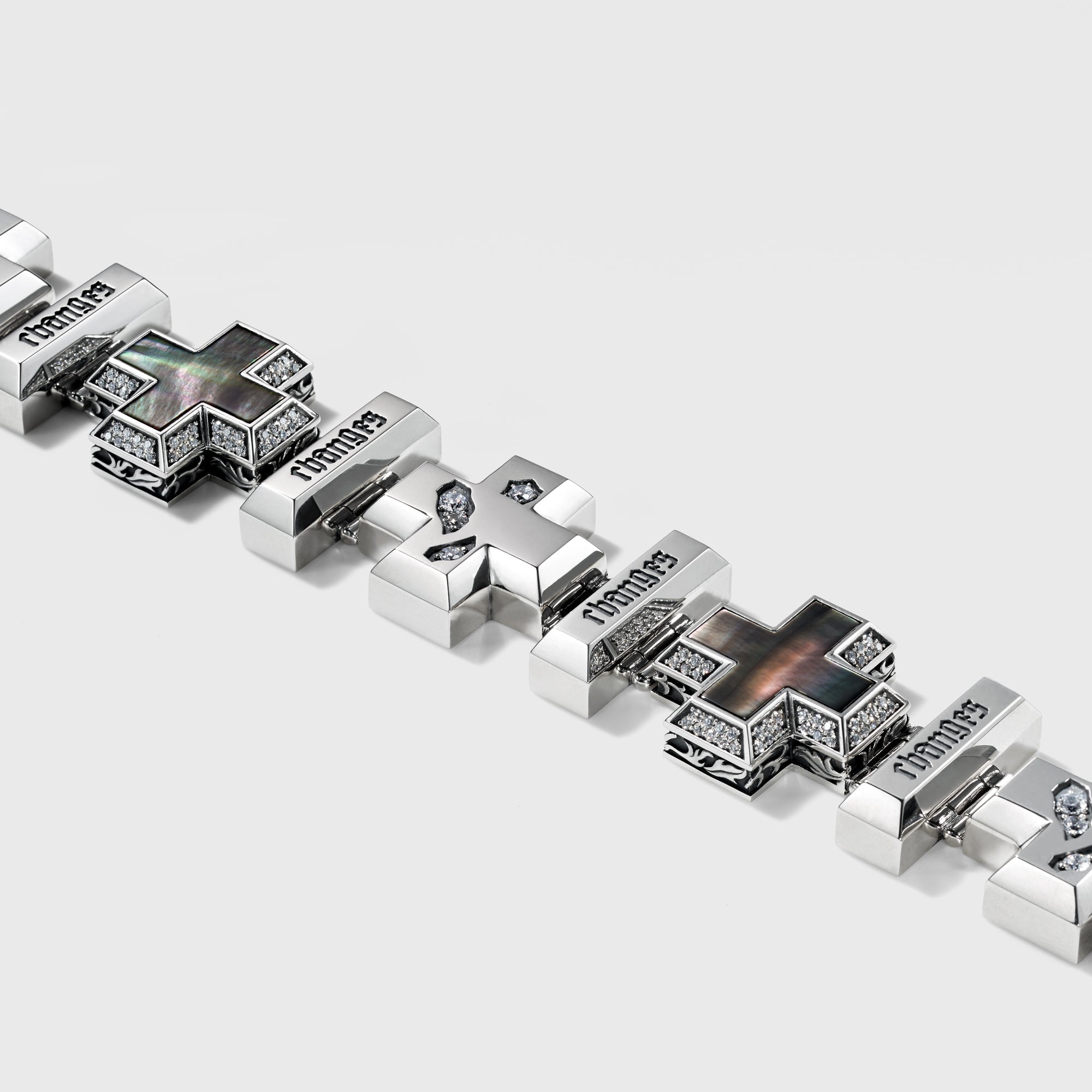 A bracelet has heavy cross motifs. Black pearl crosses have tilted side surfaces covered by clear gemstones on the base. The gems on broken crosses express the sunlight shining into the gaps. The "CHANGES" sculptured parts and the arabesque pattern surrounding the crosses are stunning. The joint buckle naturally blends into the design and uses an exclusive part which is easy to open and close.