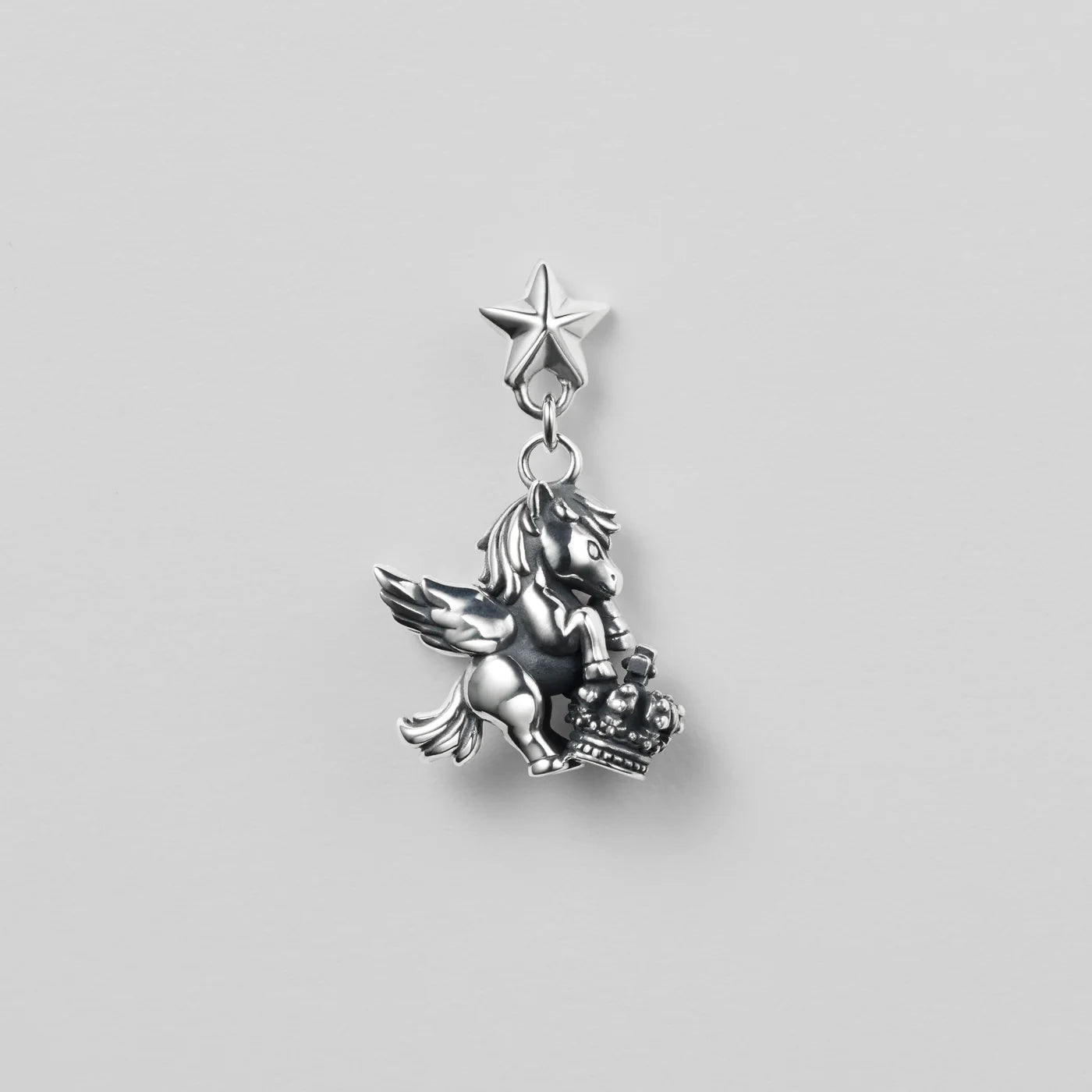 A Pegasus motif earring accented with a crown and star, softly shining at the ear.