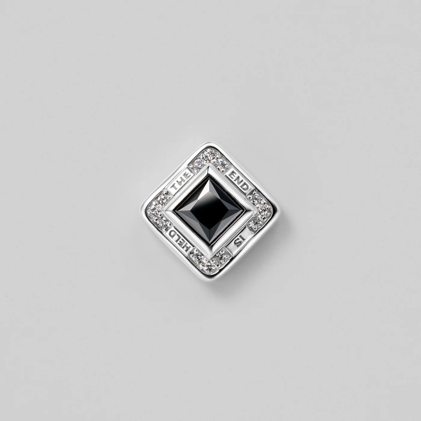 A refined square silhouette set with a single stone at the center, surrounded by stones that shine with a contrasting brilliance.