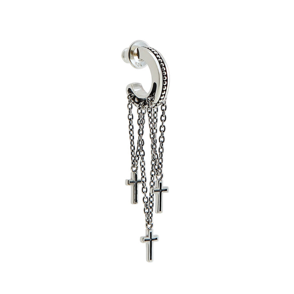Hoop earring features rosary style cross swinging. Uses hypoallergenic K18 post. *single earring