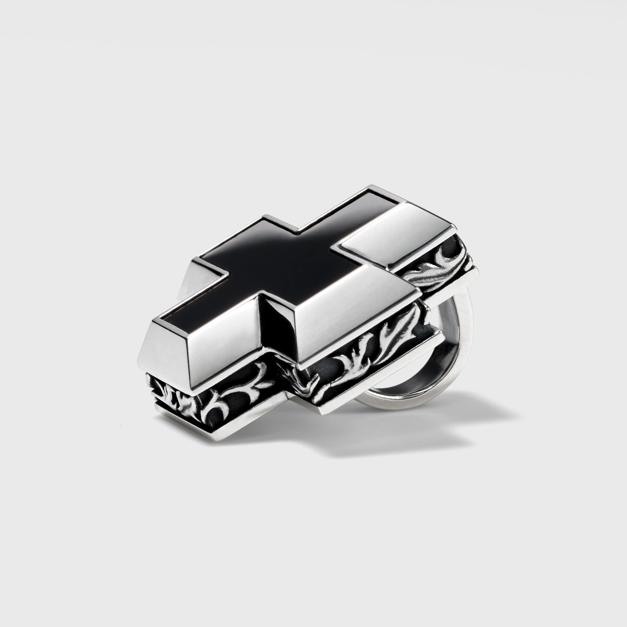 A pendant features a cross-shaped Onyx. The "CHANGES" is sculptured on the inner side and the arabesque pattern surrounding the cross is stunning.